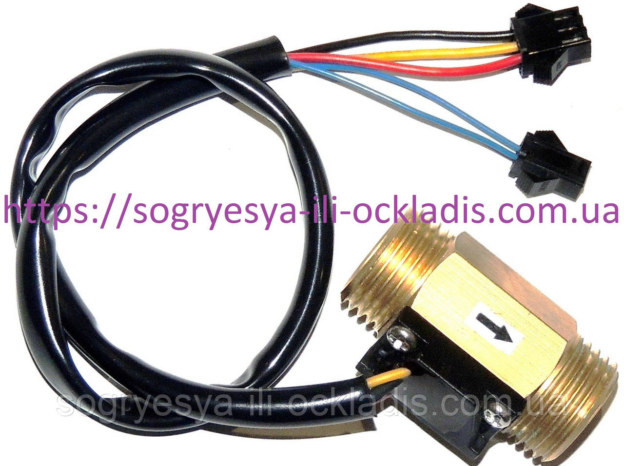 Датчик/реле/ вузол контролю протоку + НТС/NTC/ температури води/HBC латунний 44 мм — довжина під'єднання різі 1/2" зовнішня у зборі 3 + 2/три + два дроти + адаптер/клема/ фішка типу "тато" 3 + 2/3 + два виходи (без фірмового паковання, пр-во Китай) котлів — колонок газових різних модифікацій, артикул TP27ТК, код запчастини 0122/3.