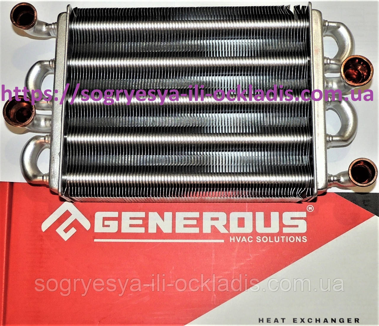 Теплообмінник/ТО БІ/ бітермічний "GENEROUS" під'єднання "кліпса — кліпса" 225 * 180 мм - довжина/ширина робочої зони (фірмова упаковка/ф.у, пр-во Туреччина) котлов газових Ferroli Domiproject C24D, Domiproject F24D, FerEasy C24D, FerEasy F24D, Domicondens F24, Domicondens F28, Domina C24 N, Domina F24 N, арттик/улт. 39841310 Т (39837660Т, 77890008019), код запчасти/ к.з. 0655/2.
